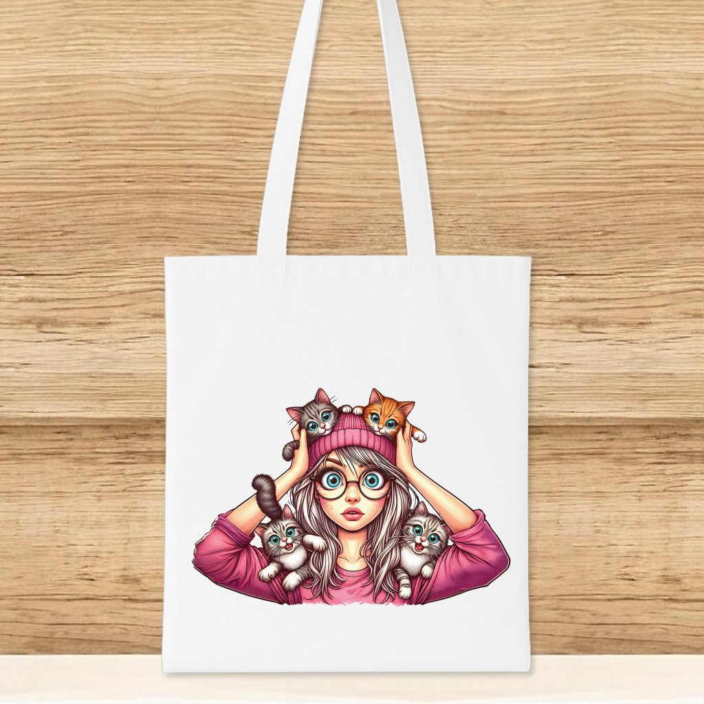 Bavlněná taška - žena s kočkami - bílá