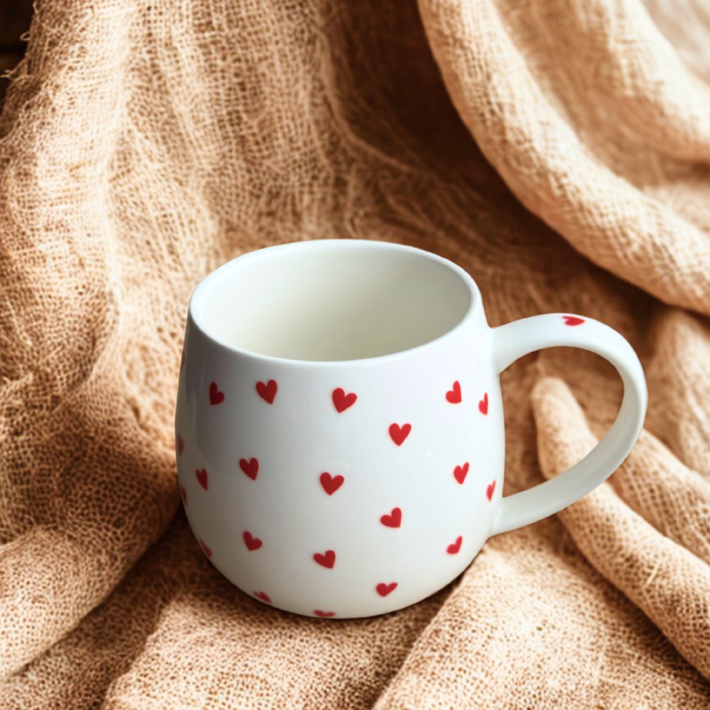 Bílý keramický dekorativná hrnek o objemu 300 ml zdobený drobnými červenými srdíčky. Motiv je vytvořen pomocí UV samolepek, které zajišťují syté barvy a hladký povrch.
