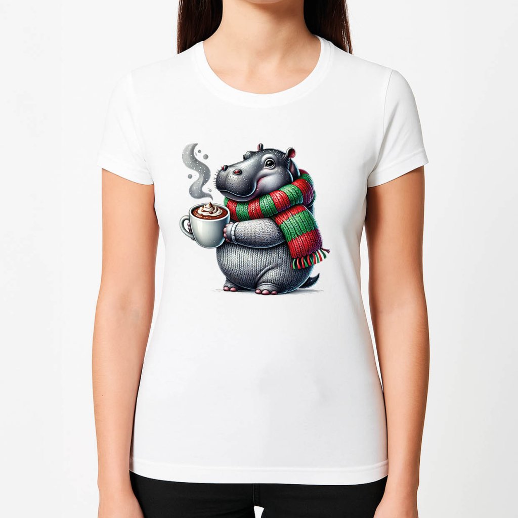 Dámské tričko s potiskem - Hroch v šále - bílé