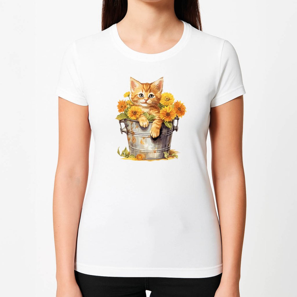 Dámské tričko s potiskem - Kočka v kyblíku - bílé