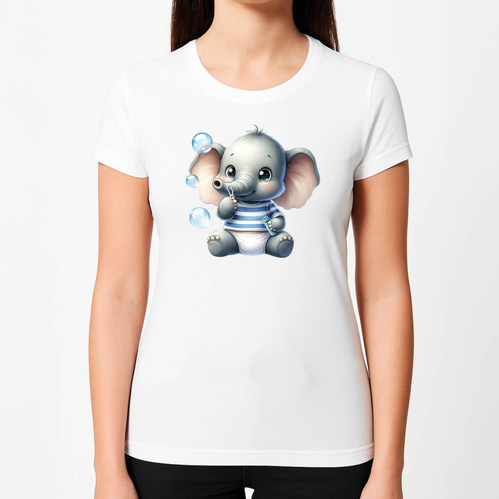 Dámské tričko s potiskem - Slon s bublifukem - bílé