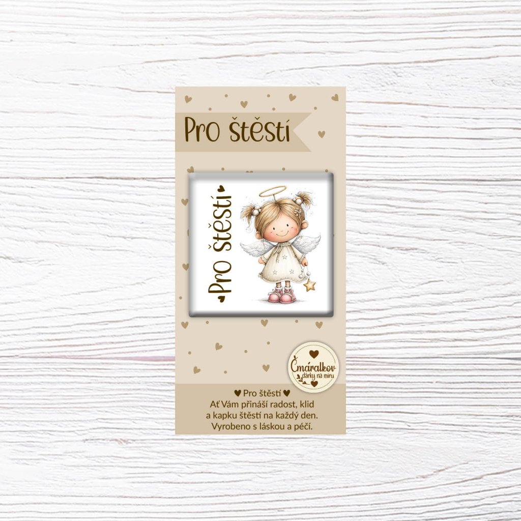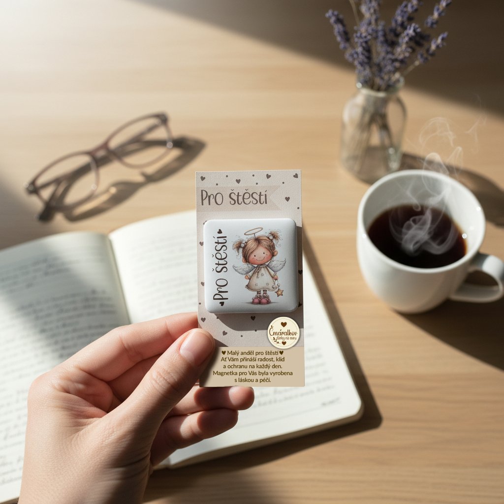 Čtvercová magnetka o velikosti 5 × 5 cm s motivem Andělka pro štěstí je malý symbol radosti a ochrany,