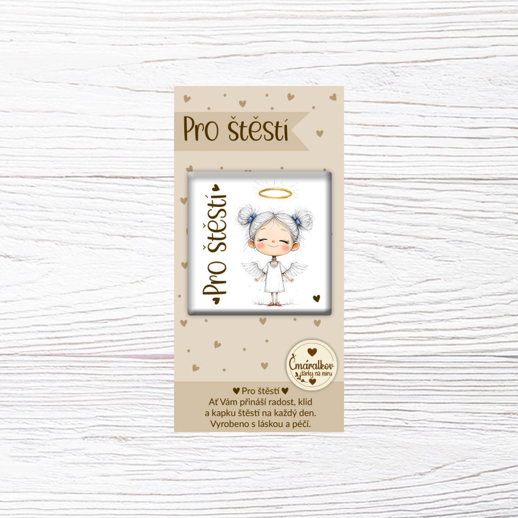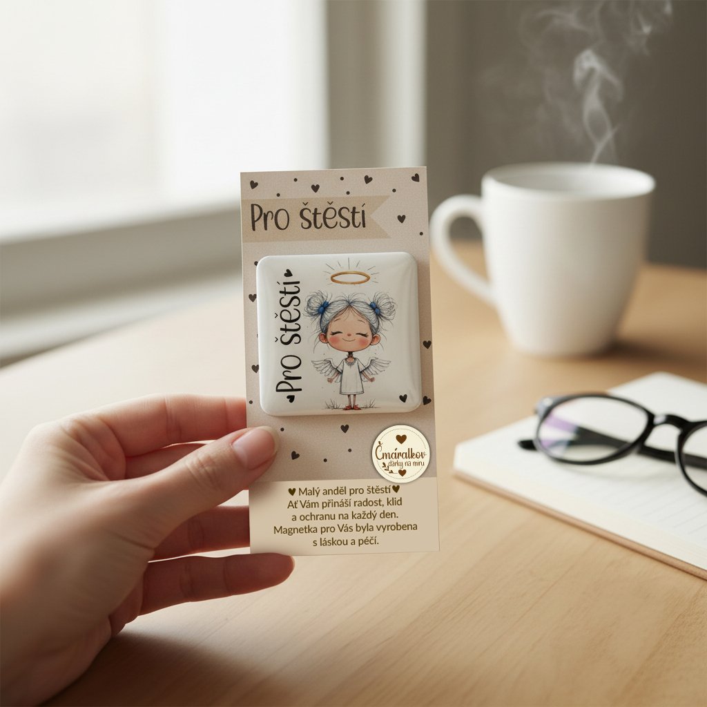Čtvercová magnetka o velikosti 5 × 5 cm s motivem Andělka pro štěstí je malý symbol radosti a ochrany, který Vám může zpříjemnit každý den. Skvěle se hodí na lednici, magnetickou tabuli nebo jako drobná pozornost pro někoho blízkého.