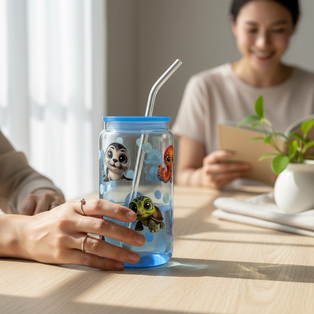 Ombre sklenička s brčkem a víčkem 500 ml - Podmořský svět