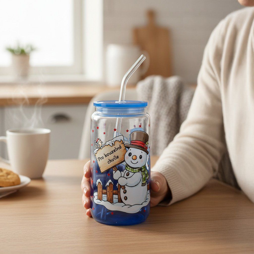 Ombre sklenička s brčkem a víčkem 500 ml - Sněhulák