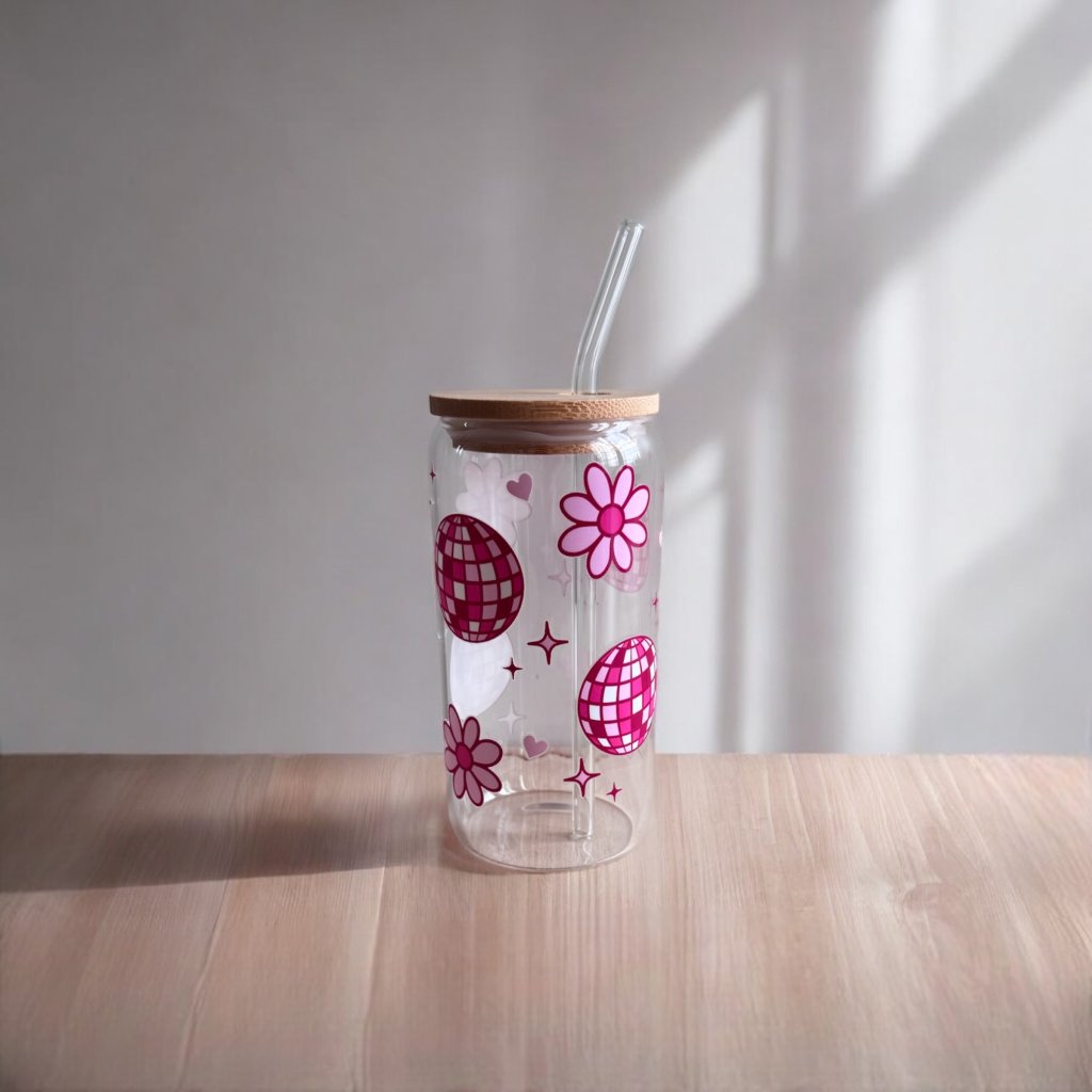 Sklenička diskokoule, květiny - brčko a víčko součástí