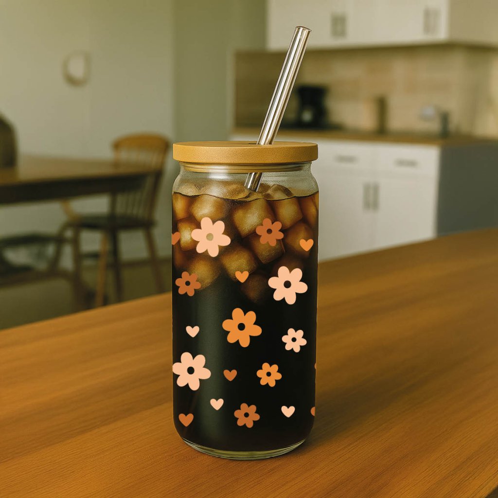 Sklenička kytičky hnědooranžové - brčko a víčko součástí